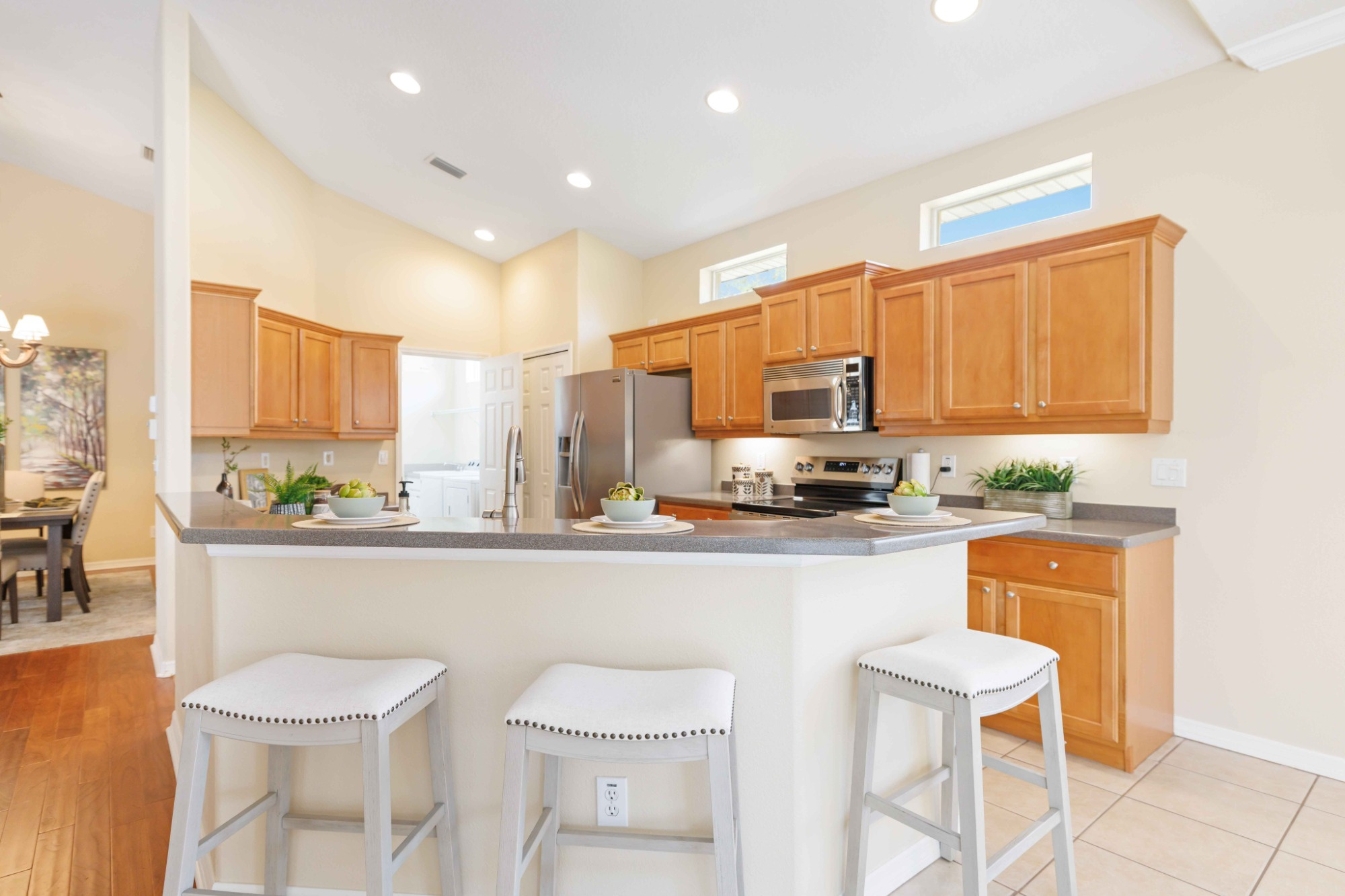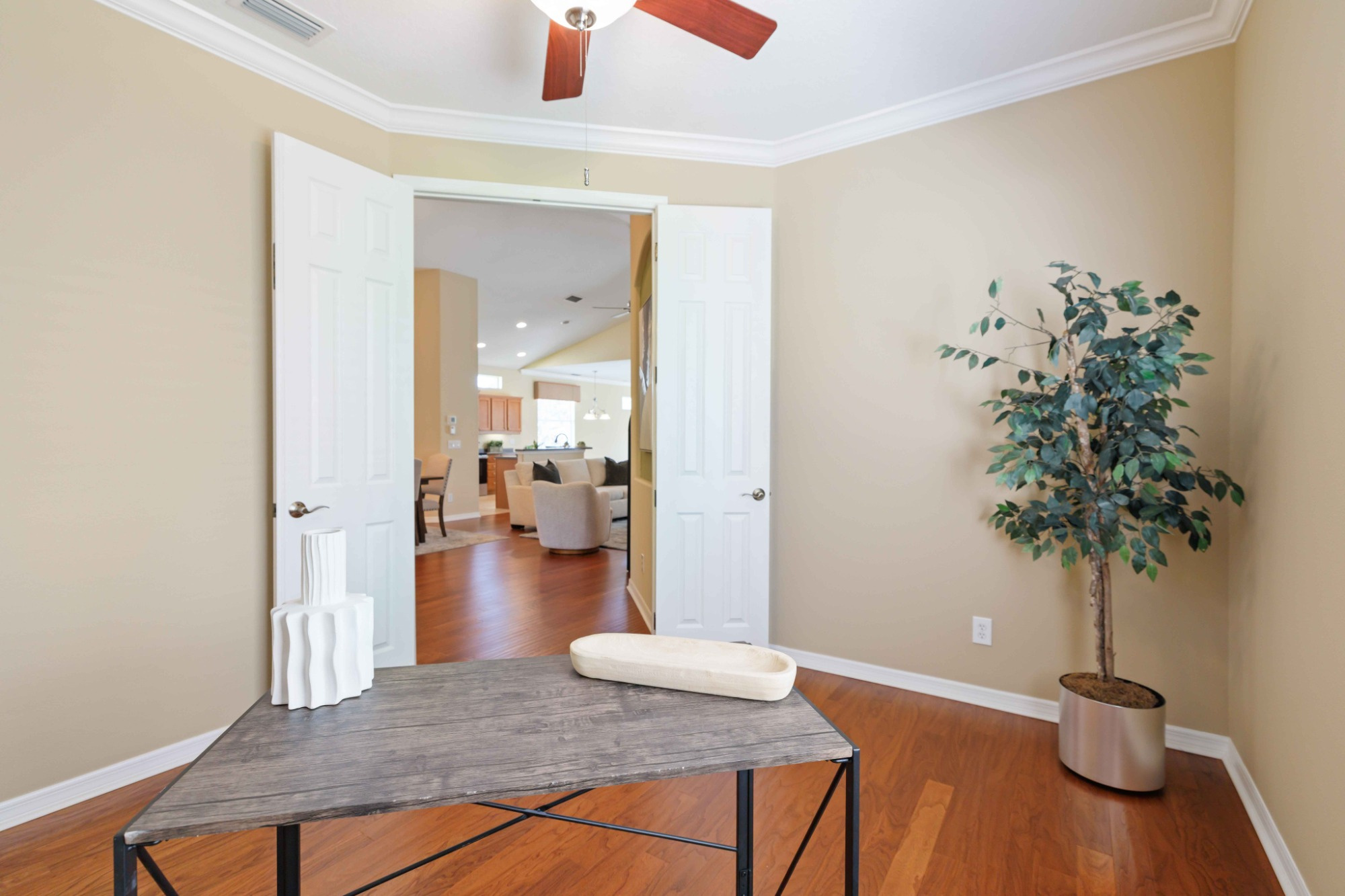 Welcome to River Wilderness—where Florida living feels intentional, refined, and refreshingly not cookie-cutter. Tucked away on a quiet, wooded street in Parrish’s only gated golf community, this beautifully maintained single-family home offers the rare combination of privacy, space, and flexibility buyers crave—but almost never find. With 2 bedrooms + a den/study easily converted to a 3rd bedroom, 2 baths, and 2,000 sq ft of thoughtfully designed living space, this home lives larger than the numbers suggest. From the moment you step inside, you’ll notice the vaulted and high ceilings, fresh interior paint, and a clean, timeless palette accented by tile and engineered wood flooring, with brand-new carpet in the family room and bedrooms. Details matter here—crown molding, faux wood blinds, and maple cabinetry elevate the space, while a new HVAC system and new stainless steel appliances (including refrigerator) bring peace of mind. The heart of Florida living is outdoors—and this home delivers. A spacious, covered and enclosed screened lanai, with access from three rooms in the home, becomes your private retreat, overlooking a serene preserve with no rear neighbors (and no front neighbors as well). Morning coffee, intimate dinners or happy hours, quiet evenings surrounded by nature—this is the kind of outdoor living that sells the lifestyle, not just the house. The primary suite is a true sanctuary, featuring two walk-in closets, dual vanities, a soaking tub, and a separate walk-in shower—a spa-like escape at the end of the day. Add in an oversized, extended 2-car garage (complete with exterior door to yard, new garage door opener, and freshly painted garage floor), washer and dryer, tile roof, and you’ve got a home that’s as practical as it is polished. Located in **The Hammocks**, River Wilderness’ **maintenance-free area**, residents enjoy their own private community pool, while still having access to the broader amenities of this 18-hole championship golf community. Optional memberships mean you can enjoy a beautifully remodeled country club complete with restaurant dining (also open to the public on a select few days of the week), a more casual pub/bar to enjoy after a round of golf, tennis, pickleball, fitness center, resort-style pool, and a calendar of social events, without mandatory country club fees. (Club Amenities & membership types/fee information available). Set along the Manatee River, River Wilderness also offers a boat ramp, boat & RV storage, and manned gate security, all with NO CDD fees. And no worries: this serene oasis home is located in an X flood zone for peace of mind. This is Gulf Coast Florida at its best—close to world-class beaches but without the tourist traffic , year-round outdoor recreation, and yet tucked into a quiet, upscale community that appeals equally to families, professionals, and retirees seeking privacy, prestige, and lifestyle without pretense. Homes like this—**move-in ready, gated, golf-community living in 34219**—are rare. This one? Even rarer.